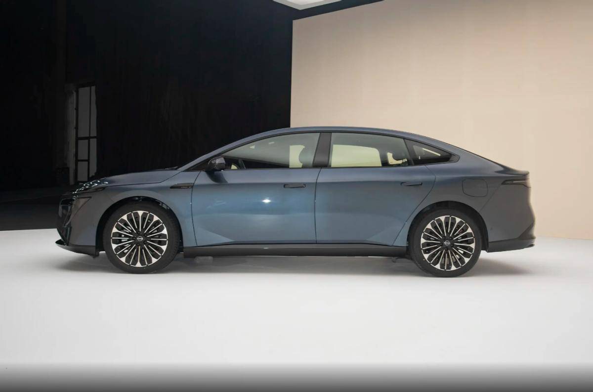 初见日产N7时,7月的烈阳让整个车身的金属光泽越发高亮,车头采用了封闭式前脸,贯穿式灯带与两侧“7字形”的远近光灯组形成了前卫的观感,突破了传统燃油车的设计桎梏。车侧采用了溜背式的车顶结构,无边框车门设计让人眼前一亮,搭配上立体化的腰身型面也增加了整体的轿跑气质。车尾采用了贯穿式的灯组设计,并配有“NISSAN”的字母LOGO,车尾包围件则设计简约,上扬的底部护板也提升了紧致感。
